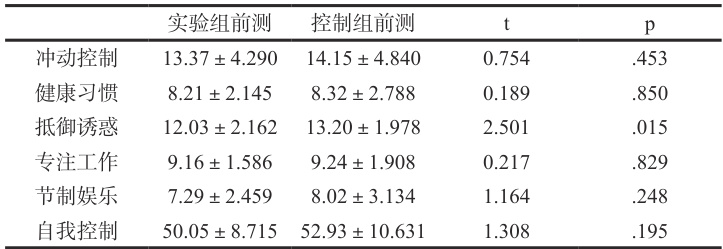 表1 实验组和控制组自控力的前测比较( M±SD )