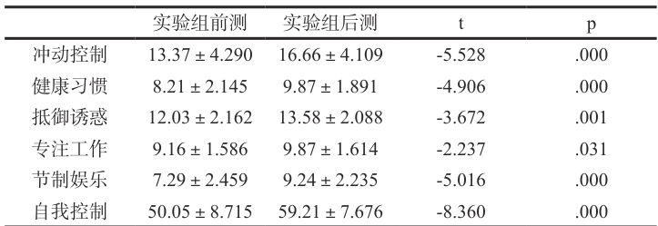从表 2 可知,实验组后测自控力总分及五个维度都发生了显著的变化( p<0.05 ),也就是说实施课程干预后,实验组的自控力有显著提升。