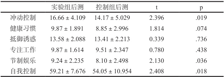 对实验组和控制组进行前测比较,表 1 显示除抵制诱惑维度上控制组显著高于实验组外,实验组和控制组在自我控制总分及其余四个维度上没有显著性差异( p>0.05 ),也就是说在实施课程干预之前,两组被试基本上是同质的。