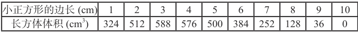 设计目的:让学生通过将 σX 的值代入公式,初步体会在 σX 取整数值的情况下, x 等于 3 时,体积最大,达到最大前后,体积随着 σX 的增大而减小。