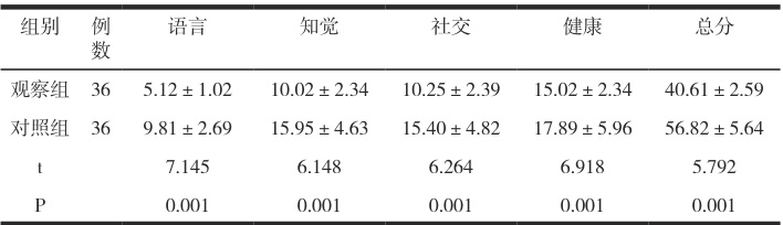 本文选取 72 例孤独症谱系障碍患儿资料。观察组(n=36)性别:男 / 女 =21/15 例,年龄 3\~16 岁,均值(8.91±2.31)岁。病程 1\~3 年,均值(1.15±0.13)年。对照组(n=36)性别:男 / 女 =22/14 例,年龄 3\~17 岁,均值(8.90±2.32)岁。病程 1\~3 年,均值(1.06±0.16)年。两组患儿具有可比性(P >0.05)。
