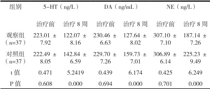 2.2 神经递质水平治疗前5-HT 等神经递质指标相近 Φ⋅P>0.05 );治疗8 周,对照组5-HT、DA、NE 较高,观察组较低(P<0.05)。见表2。 表 2 2 组神经递质指标比较[,