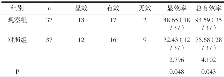 2.3 临床疗效观察组显效率 (48.65%) 、总有效率(94.59 %)>对照组(32.43 %)、(75.68 %)( P<0.05)o 见表3。表 3 临床疗效比较 [n, %(n)]