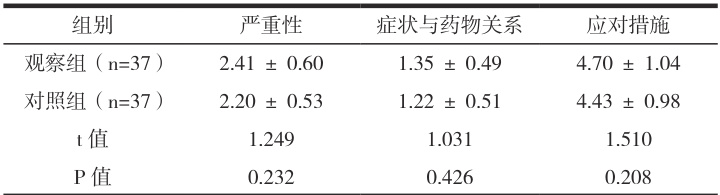 本研究符合赫尔辛基宣言。选取 74 例 2023 年 8 月 \~2024 年 7 月 BD 病例,对照组 37 例(情感稳定剂),男 19 例,女 18 例;年龄(21\~58)岁,平均(32.80± 8.00)岁;BD 病程(0.5\~4.5)年,平均(2.39 ± 0.62)年。观察组 37 例(情感稳定剂 + 小剂量抗精神病药物):男 20 例,女 17 例;年龄(20\~59)岁,平均(32.74±8.05)岁;病程(0.5\~4.0)年,平均( 2.43±0.65 )年。资料可予分析( P>0.05 )。1.2 纳入、排除标准