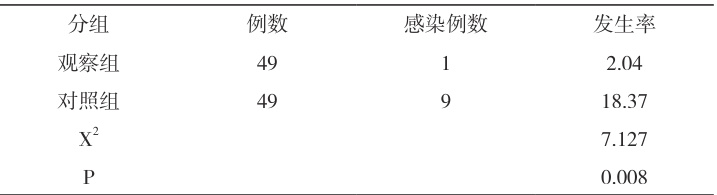1.3.1 医院感染发生率:对患者进行为期 7d 的随访,统计期间出现感染的例数。
