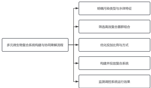 在农村黑臭水体的治理当中,单一功能菌难以契合多类污染物同步降解的需要,于是需要构建多元微生物复合系统,该系统联合投加好氧菌,借助其于不同营养源及氧化还原环境下的互补特性,增强整体协同降解能力,江西一个村落治理养殖废水所污染的沟渠时,使用硝化—反硝化—磷吸收复合菌组投放方案,实现氨氮去除比例达 85% 以上,有效减轻水体异味,改善浊度。在实施这一过程期间,应按照水体特征开展实验筛选及功能评估,选择适应力出色、活性程度高、协同性不错的菌株,并按恰当比例进行调配,保障其在水体里稳定定植并繁殖,以构建此类复合微生态系统为途径,不仅使污染物的降解速度变快,也强化了系统的环境适应与自我修复本领,由此提升农村黑臭水体治理的整体功效。如图1 所示。