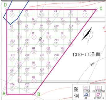注浆加固采用地面直孔结合定向斜孔逐排施工驱水固沙,共设计 43 个地面直孔或者定向斜孔,一开设计工程量10045m,二开设计工程量 1290m,共计钻探工程量 11335m,预计注浆量 32000t。钻孔平面布置见图 2。