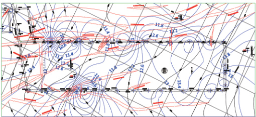 在基于 1010-1 工作面周边钻孔及两条巷道实际揭露煤厚情况所绘制的等值线图范围内,垮落带和导水裂隙带发育高度等值线的整体变化趋势由工作面中部向两端逐渐增大,综合分析可知,1010-1 工作面内垮落带发育高度变化范围为7.96-14.17m ;导水裂隙带发育高度变化范围为30.60-55.61m。