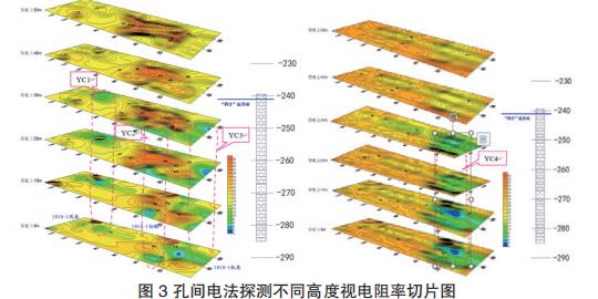 根据并行电法探测结果可知,1010-1 工作面顶板范围内主要存在 4 个相对低阻区域,分别定义 YC1、YC2、YC3 和 YC4,低阻区域主要位于 1010-1 工作面顶板砂岩和泥岩层位之间,结合地质资料及现场实际钻探情况得知,低阻区域可能为注浆析出水或顶板砂岩裂隙水影响所致;此外顶板上45m 和50m 两张视电阻率切片图反映的是治理区段顶板“四含”的情况,可以这两张切片绝大部分区域视电阻率值较高,富水性弱,表明该区段注浆改造效果显著。