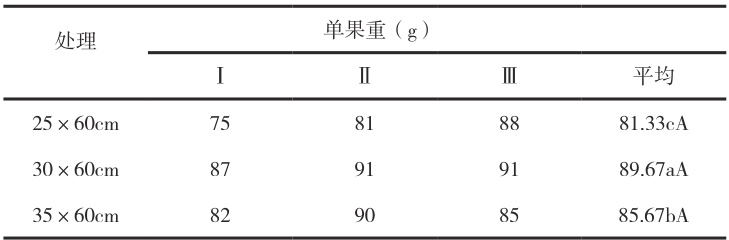 30×60cm 密度下单果重( 89.67g )和亩产(10541.57kg/666.7 ㎡)均显著优于其他处理( P<0.01 )