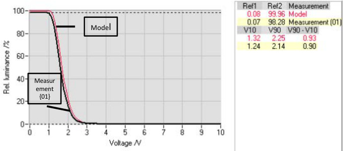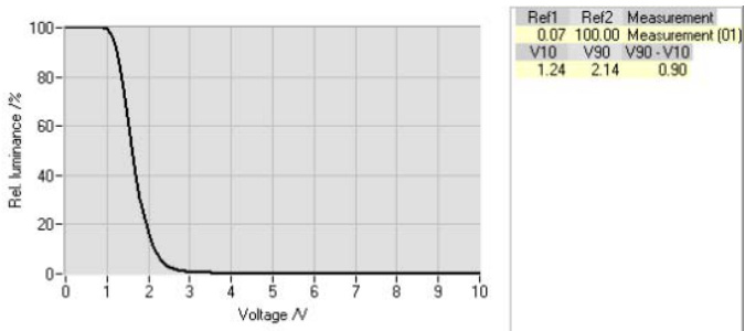 数据处理:根据采集到的数据,计算不同电场强度下液晶材料的透过率(透过光强与初始光强之比)。绘制透过率 - 电场强度曲线,分析曲线的特征,如阈值电压(透过率开始明显变化时的电场强度,一般用V10 表示)、饱和电压(透过率达到稳定时的电场强度,一般用V90 表示)等电光特性参数。