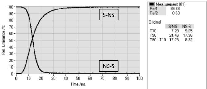 除了透过率与电场强度的关系,液晶材料的响应时间也是重要的电光特性参数。响应时间包括上升时间(从施加电场到透过率达到 90% 饱和值所需的时间即 NS-S 过程 T90-T10,一般用 Ton 表示)和下降时间(从撤去电场到透过率恢复到 10% 饱和值所需的时间即 S-NS 过程 T90-T10,一般用 Toff 表示)。通过在施加和撤去电场的瞬间,快速采集光强随时间的变化数据,可以计算出液晶材料的响应时间。一般来说,响应时间越短,液晶材料在光电器件中的应用性能越好。实验测得该液晶材料的上升时间为 8.32ms ,下降时间为 17.23ms ,表明其在快速光调制应用中具有一定的潜力。