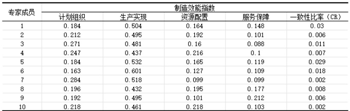 为了提高评价结果的科学性,指标权重的确定过程主要采用 AHP 层次分析法。分析过程,笔者邀请了制造领域10 位专家参与访谈与统计。