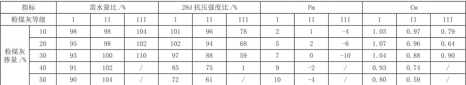 表1 不同等级和不同掺入质量系数的粉煤灰的Pm 和Cm 值