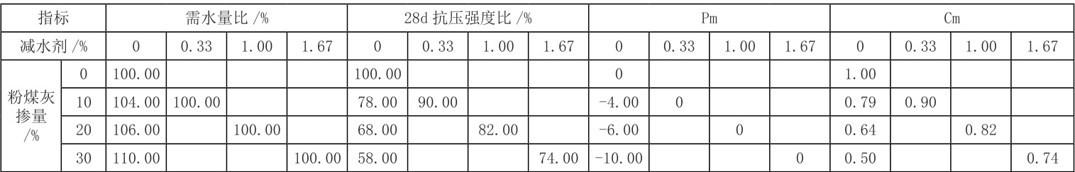 表2掺入不同剂量的粉煤灰和减水剂时水泥砂浆的Pm 和Cm 值