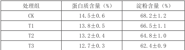 种子老化对青稞品质也产生了明显影响(表3)。实施老化处理后,青稞籽粒的蛋白质含量连同淀粉含量均有所下滑,以对照组为参照,重度老化组(T3)蛋白质含量降低 12.4%,淀粉含量出现8.7% 的下降,这大概与老化种子生长时代谢陷入紊乱、物质积累遭遇阻碍有关。