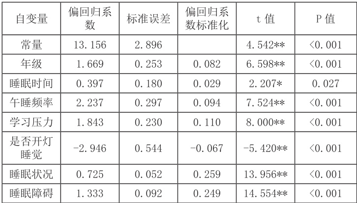 以心理健康水平为因变量,年级、学习压力、午睡频率、睡眠时间、是否开灯睡觉、是否独立睡觉、睡眠状况、睡眠质量、睡眠障碍为自变量进行多元线性回归分析。结果显示,年级越高,睡眠时间越短,午睡频率越低,学习压力越大,睡眠状况越差,睡眠障碍越严重,心理健康问题越多。