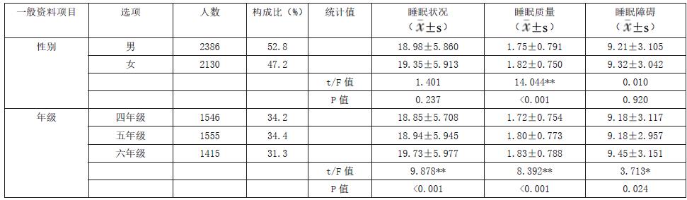 4.1 安徽省小学生睡眠状况、睡眠质量和睡眠障碍情况分析
