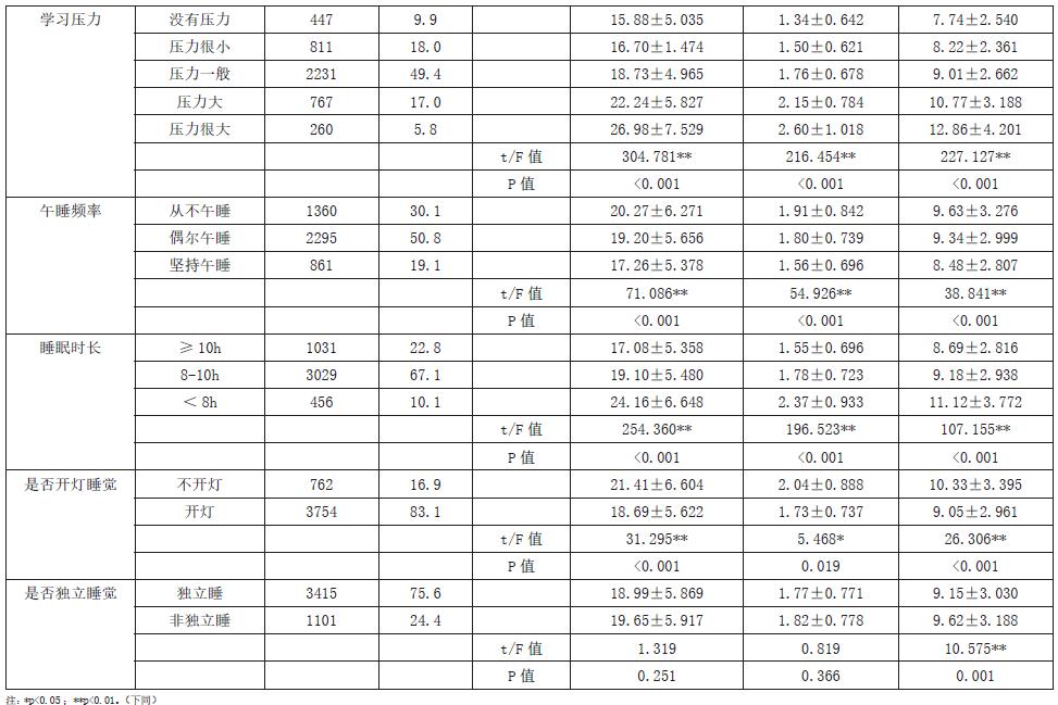 本研究共纳入 4516 名小学生,平均每天睡眠时间为(9. 04±1 .20)小时,4.7%(210 名)报告了睡眠状况较差,0.4%(16名)报告了睡眠状况非常差;睡眠质量差和睡眠障碍的检出率分别为 2.8% 和 14.4%。对一般资料项目小学生的睡眠状况、睡眠质量和睡眠障碍情况进行比较,结果显示,女生睡眠质量比男生差;非独立睡觉比独立睡觉的睡眠障碍发生率高;在睡眠状况、睡眠质量和睡眠障碍这 3 个指标上,年级、学习压力、午睡频率、睡眠时长、是否开灯睡觉的差异有统计学意义,具体情况见表1。