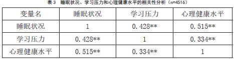 睡眠状况与学习压力呈正相关(r=0.428);睡眠状况与心理健康水平也呈正相关(r=0.515);学习压力与心理健康水平同样呈正相关(r=0.334)。