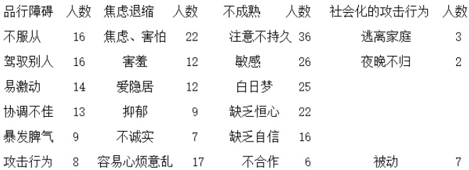 本研究采用问卷调查法,选取小学毕业班 52 名学生作为调查对象。问卷依据美国心理学家 H⋅C ·奎伊对学生心理健康问题的症状分类设计,涵盖品行障碍、焦虑退缩、不成熟、社会化的攻击行为等多个维度,旨在全面了解毕业班学生的心理健康状况。