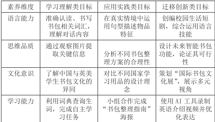 1. 知识维度:学习用品词汇(schoolbag, notebook 等)及句型(What’sin...? I have...);
