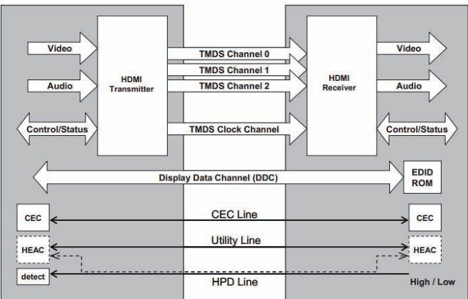 HPD Line(Hot Plug Detection):热插拔检测线路,用于检测接收端设备是否连接或断开。当设备连接时,HPD 线路电平变化通知发送端,发送端据此准备传输信号