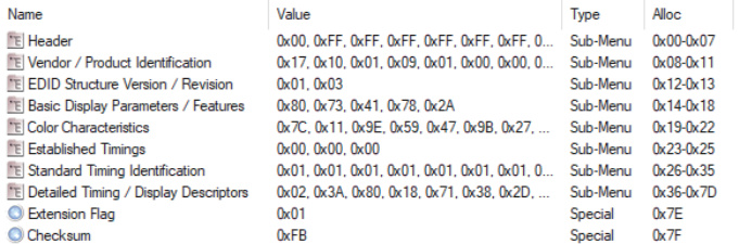 一份 EDID 数据由 128 个字节的基本数据块 (Block 0) 和拓展数据块 (Block 1) 组成,Block 0 是必须要有的 , 包含以下关键字段: