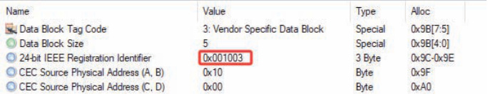 HDMI 规范规定:只有 IEEE 数据标识符的值为 0x000C03 的设备,才会被认为是 HDMI 设备,否则,被当作 DVI 设备处理,这样就没有声音输出了。