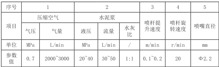 (1)确保机器平稳及角度准确,减少或避免倾角偏差。(2)注浆前检查管路系统密封性,确保无杂物,否则影响压浆。(3)注意泥浆排放,冒浆量超过 20% 时应停止喷射,找出并尽快解决问题。(4)控制水泥用量,根据情况调整浆液压、喷嘴直径、提升速度,以满足要求。