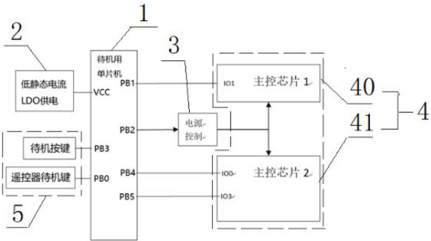 主控模块4 包括第一主控芯片单元40 和第 控芯片 信号输出接口与第一主控芯片单元40连接,第一主控芯片 所述第二主控芯片单元 41 连接。 本设 与待机用单片机1 的第一 信号输出 主控芯片单元 41 与待机用 控模块中的所有主控芯片的 脚数量,从而使得本设 出引脚是独立的,当采用待 脚, 例如当主控模块中为两个主控芯片 换待机用芯片则将增加功耗)。