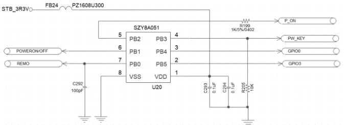 待机用单片机的第一信号输出接口和第二信号输出接口均设置成推挽模式,即待机用单片机 SZY8A051的各 IO 口设计均不使用外部上拉电阻模式,同时,第一信号输出接口和第二信号输出接口设置成推挽模式可以进一步降低待机用单片机的待机功耗。