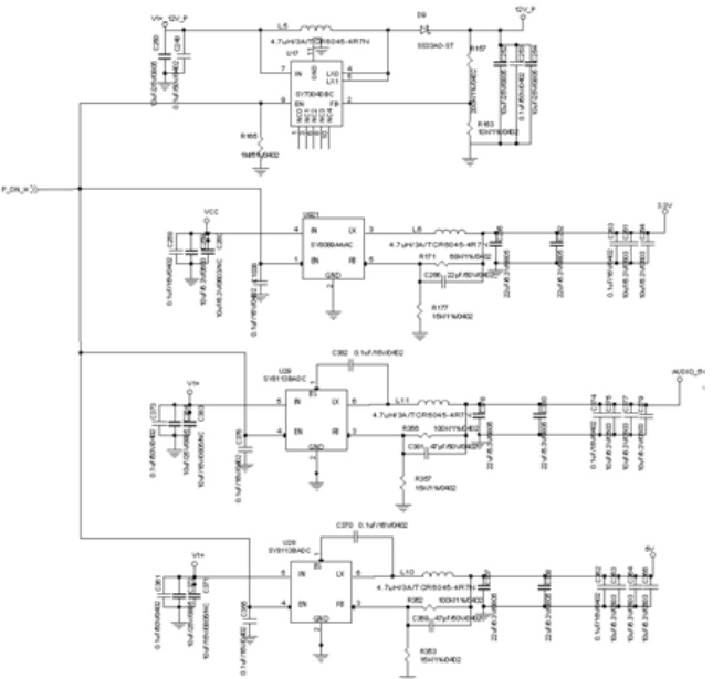 如图 4 所示,电源控制模块包括多个电源控制单 二信号输出接口分别与每个电源控制单元的使能端连接。在本设计中,便携式移动 3.3V电压、AUDIO-5V 电压以及5V 电压以用于给机芯、处理器 源芯片 SY7304DBC、SY8089AAAC、SY8113BADC和 SY8113BADC 组成供 信号输出接口(PB2)分别与电源芯片 SY7304DBC、SY8089AAAC、 C 和 SY8 13BADC 的使能引脚连接,以由第二信号输出接口输出控制信号使能电源芯片,从而对主控模块进行断电。