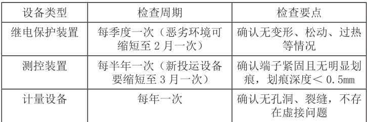 电力系统电气二次设备最基本的检修技术就是定期检查、维护与测试。首先是定期检查,主要检查设备的外壳、接线以及散热状况等,以确保各项设备的运行良好,如设备外壳需保证不出现变形、破损以及腐蚀问题,户外安装的电气二次设备,其防护漆脱落不得超过 10% ,还要对接线端子进行检查,观察是否有过热、松动等,一般端子温度不超过 70∘C ,不同设备的检查周期和要点也有所差异,表 1 为电力系统电气二次设备的大型定期检查周期与要点。其次是定期测试,即开展电气二次设备的各种性能操作测试,包括逻辑功能测试、定值校验测试、控制功能测试等,如继电保护器的动作逻辑测试,可模拟接地短路或相间短路故障,再测试其保护动作是否符合正确逻辑,确保其正确率超过 99% 即测试通过,在定值校验测试方面,继电保护器主要校验保护动作定值。最后是维护保养,电气二次设备的维护也是检修工作中必不可少的内容,比如对于各种活动部件要定期清扫,接线端子接线紧固,老化元件进行更换,以保证设备运行质量不断提高。