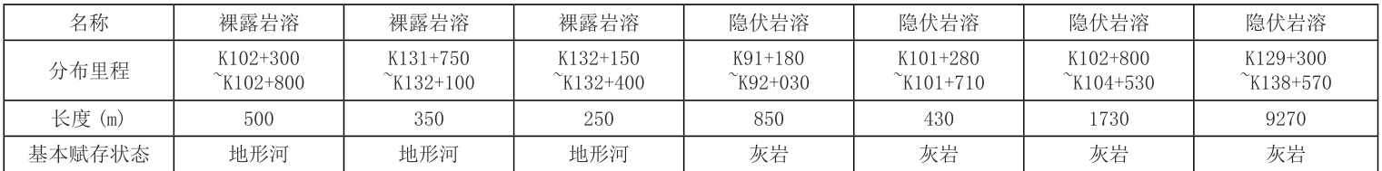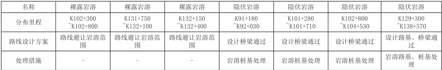 (2)岩溶对山区高速公路路线设计的影响岩溶是水对可溶性岩石的化学溶蚀作用,可能引发路基、桥梁、隧道安全问题。在实际的路线设计过程中应切实做好勘查工作,尽量规避岩溶路段。以某路段为例,其沿线范围内岩溶分布情况如表1 所示,沿线岩溶范围路线设计如表2 所示。