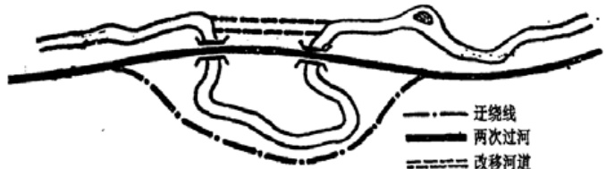 (2)河谷选线充分利用河谷坡度相对平缓的特点,为后续施工与运营创造便利条件,对山区发展也有一定积极影响。河谷选线重在换岸方案选择,需综合分析两岸地质条件,考虑不良地质影响及施工运营后病害影响,遵循保证工程安全以及规避不良地质等基本原则。河曲地段路线布线方式如图2 所示。
