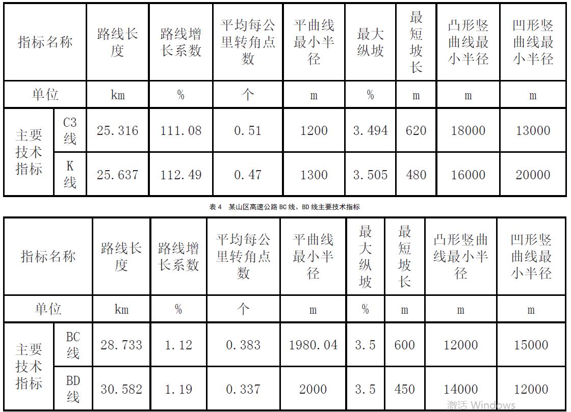 表3 某山区高速公路C3 线、K 线主要技术指标