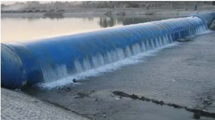 对现代河道进行治理的时候, 要机 河道的实际情况,遵循现实出发的基本原则,从中收取更多相关数据信息,保证河道内部生态环境得 到维 治理中的生态水利和环境保护建设至关重要,是保证河道生态环境质量 员必须要结合实际情况,对新型水工建筑给予重视,积极引入橡胶坝等,促使水利工程的防洪蓄水能力得到强化。橡胶坝,如图2 所示。