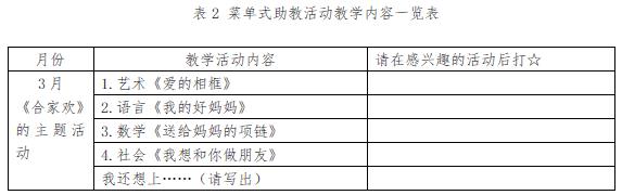 菜单式家长助教活动即全班家长都参与助教,家长可以像进餐馆就餐一样,依据教师提供的“菜单”选择感兴趣的内容和形式。当家长确定教育内容后,教师和家长就成了“厨师”——共同为幼儿准备一份“色、香、味俱全”的“营养餐。”在菜单式家长助教活动中,家长自愿参与,自主选择授课内容,自由选择教学时间,从而自主参与幼儿园的各项教育活动。