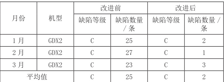 方法:在GDX2 包装机组安装调试完新式条烟整形美容装置后,设备按200条 /min生产速度运行,其中条烟单次美容时间为 0.7s,下烙铁温度设定为100∘C ,上烙铁板温度设定 85℃ -90℃,统计设备改进前后各三个月的设备运行情况,同时,根据工艺质量标准对条盒外观质量进行检测。