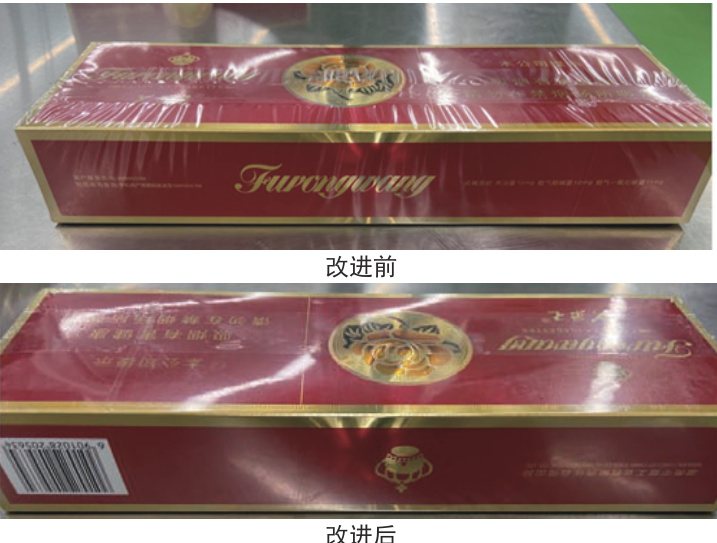 由表 1 可见,条盒外观质量主要是松散、皱褶等 C 类缺陷,重新设计开发的整形美容装置运行稳定,至今未出现维修故障,有效减少了条盒透明纸破损、皱折等质量缺陷,C 类缺陷样品数量大幅降低,条烟外观质量明显提升,改进前后芙蓉王(红宝石)条盒透明纸整形效果对比如图11 所示。