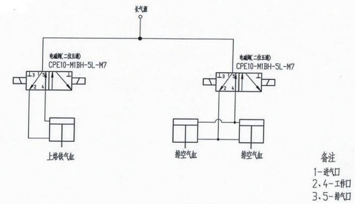 电气控制原理图如图9 所示,气路控制原理图如图10 所示,电气控制系统由 PLC 控制器、二位五通电磁阀、伺服电机等组成,控制气路和电路驱动气缸自动完成条烟整形和排空等功能。生产过程中,由光电开关得到系统动作的脉冲信号,脉冲信号经过 PLC 控制二位五通电磁阀动作,从而驱动气缸动作,完成条烟整形和排空动作。其运动状态与原机同步,可以满足包装机组额定生产能力的要求。新式条烟整形美容装置程序有两种控制方式,MICRO 的设备可以由原机控制,并在 HMI 上设定温度,倍福的设备采用欧姆龙公司生产的 CP1E-N20DT-D(PLC)和三棱伺服系统控制器,需外挂一个小电控柜。