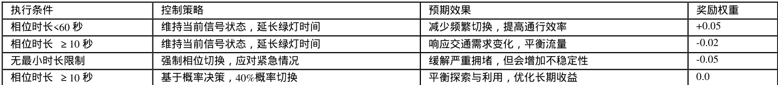 本系统定义了四种基本控制动作,对应不同的交通控制策略[表 2.1] 。其中智能优化动作基于当前交通状态和历史经验进行概率性决策,在 40% 的概率下选择切换相位,体现了系统的自适应学习能力。