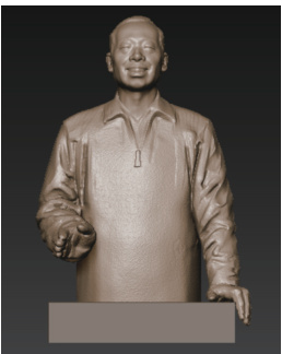 第一阶段为构思及手绘画稿,通过调研确定人物形象。(图 1)第二阶段为陶瓷泥塑头像制作,强调基本构图与神情结构;(图 2)第三阶段借助 ZBrush 完成数字化半身像建模,进一步精细化面部表情与服饰处理。图 3 最终输出光敏树脂材料模型,尺寸控制在75.89 厘米高,利于室内展示与后期复制拓展。(图 4)