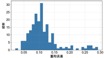 训练过程中模型的损失曲线如图 1 所示。可以看到,训练损失与验证损失在前 20 个epoch 内快速下降,并在 30 epoch 后趋于平稳,验证损失未出现明显过拟合。在测试集上计算所有样本的重构误差,并绘制柱状图,如图 2 所示。正常样本的误差集中在 0.05–0.15之间,而异常样本的误差主要分布在 0.20 以上,可清晰区分两类样本。
