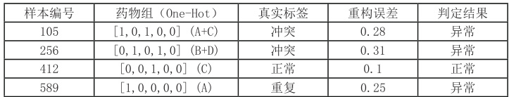 表 1 展示了几条典型的异常检测结果,包括输入的药物组合、真实标签、重构误差以及模型判定。由表中可见,冲突用药组合 A+C (样本 105)和 B+D(样本 256)的重构误差分别为 0.28 和 0.31,远高于阈值 0.20,均被正确判定为异常;单纯使用药物 C(样本412)时误差仅 0.10,模型也准确识别为正常。对于重复用药案例 A(样本 589),重构误差 0.25 同样触发异常检测,说明自编码器能够有效区分正常用药与冲突或重复用药的异常模式。