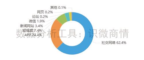 舆情主要集中在社交网络平台(主要指微博等),相关舆情量约占总量的 62.4%,其次为新闻 APP(约占 24.4%),短视频(约占 7.4%)[1]。