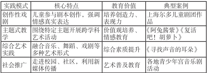 中国的小学教育里,儿童音乐剧的实践已造就多种创新模式,这些模式体现出“以儿童为中心”的教育理念。上海尔多儿童剧团作为中国原创儿童音乐剧的杰出典范,靠着《寻找声音的耳朵》《阿兔酱紫》《复活吧!胡萝卜》等一系列原创剧目,开创出特有的“尔多创作模式”。该模式的核心关键在于“无剧本创作”以及对儿童主体性的重视,与传统的“先拿到剧本,再开始排练”的制作流程有着明显区别——尔多剧团的剧目是在与孩子们互动、参与游戏以及进行唱跳训练时自然地产生出来的。