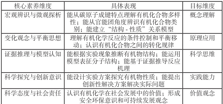基于化学核心素养的五个维度和有机化学内容特点,本单元设计了以下进阶式学习目标,如表 1 所示。这些目标体现了知识、能力和素养的有机结合,既关注学生对核心知识的理解与掌握,又注重科学思维方法和实践能力的培养,同时强调科学态度与社会责任的形成[2,3]。目标设计采用进阶式安排,从基础概念理解到原理应用,再到科学思维和实践能力培养,最后到价值观念形成,符合学生的认知发展规律 [4,5]。