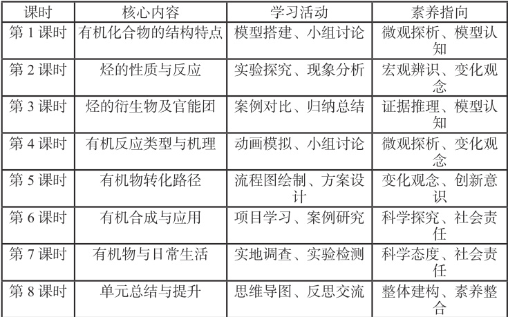 在 “有机物的性质与转化” 大单元教学中,立足化学核心素养五个维度,结合高中生认知特点与知识体系的内在逻辑,从内容重构、活动组织、评价跟进和场景拓展四个层面设计实施策略,形成环环相扣的教学闭环[4]。